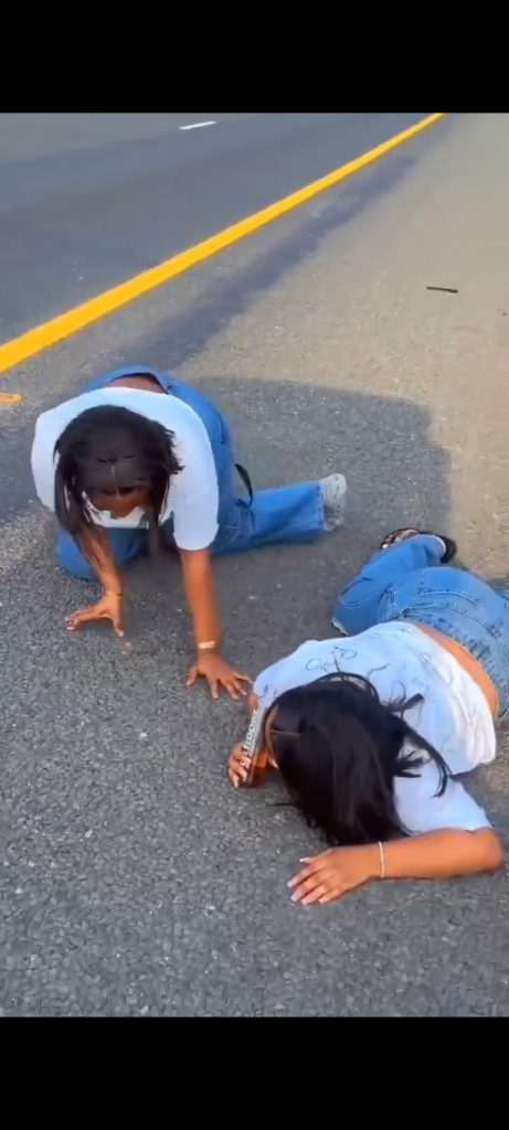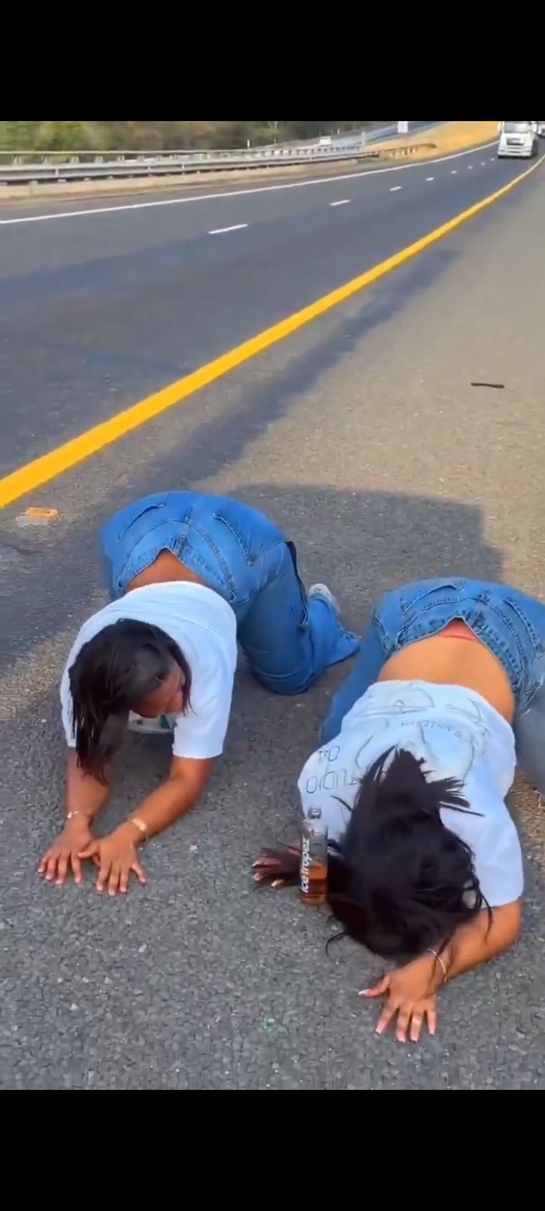 The ladies dressed in white tops and blue jeans, are twerking to oncoming cars with Icetropez beverages in their hands.
