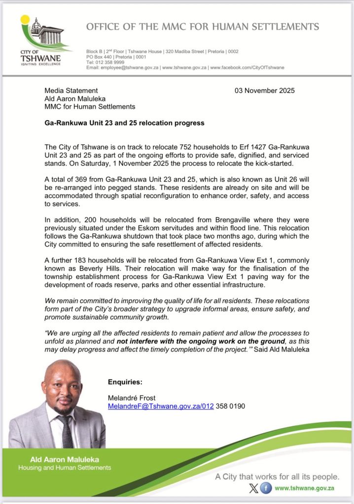The relocation follows the Ga-Rankuwa shutdown two months ago, during which the city of Tshwane committed to ensuring the safe settlement of all the affected residents.