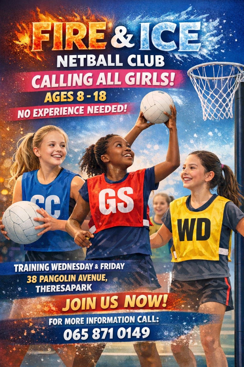 The Fire and Ice Netball Club, based in Theresapark, training at the 38 Pangolin Avenue, is calling on parents to give their children the opportunity to be part of an exciting and dynamic netball journey.