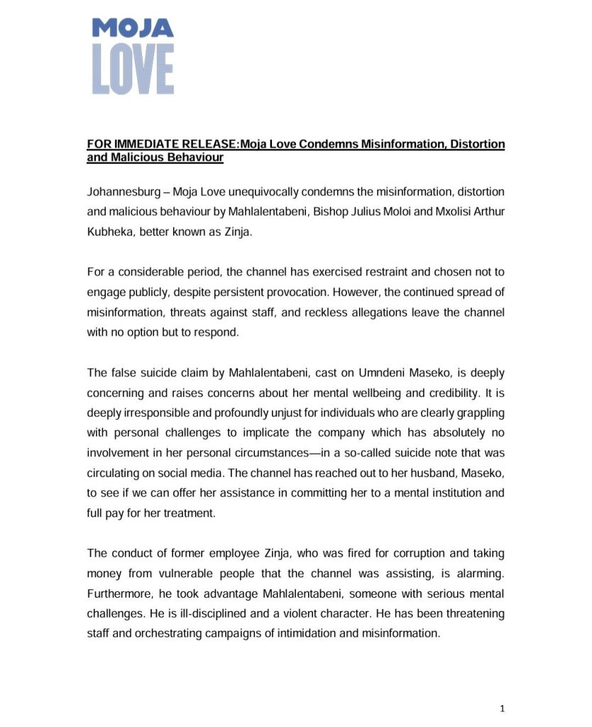“Moja Love condemns misinformation, distortion and malicious behaviour,” was an introduction to a statement released by the channel.
