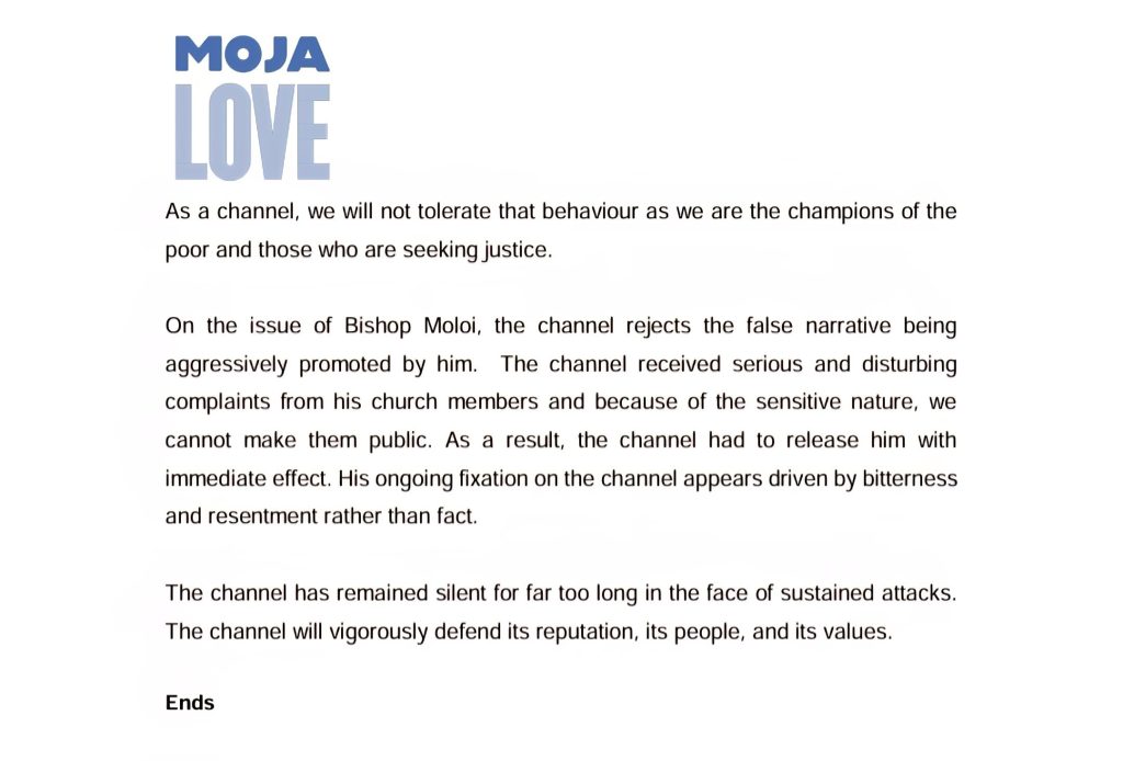 “On the issue of Bishop Moloi, the channel rejects the false narrative being aggressively promoted by him.