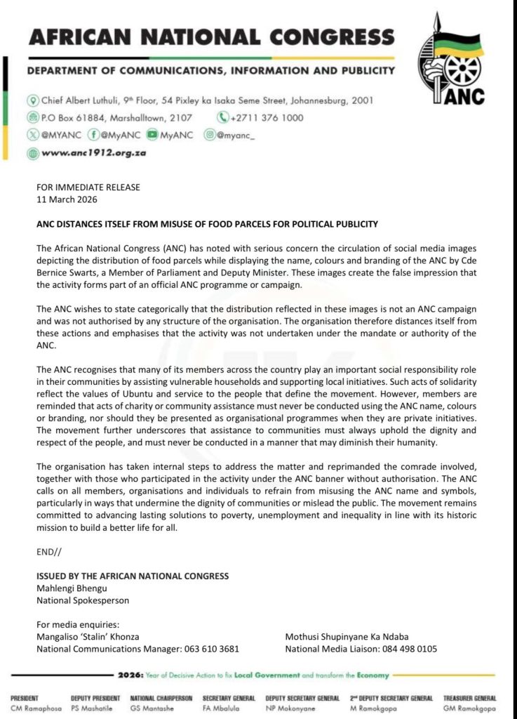 The party emphasised that while individual members are free to assist vulnerable communities, such initiatives must not be carried out under the ANC name or branding without proper approval.